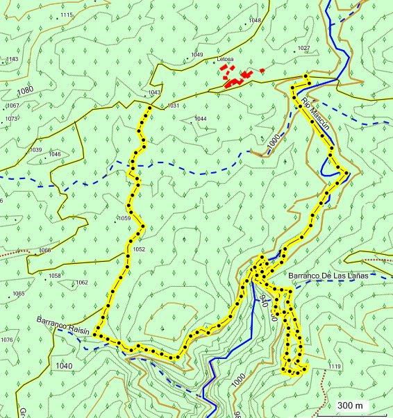 Barranco Raisin (km 1.2). Suivre le chemin indiqué par ce panneau. Vous passez un petit muret, continuer votre chemin sur la rive gauche